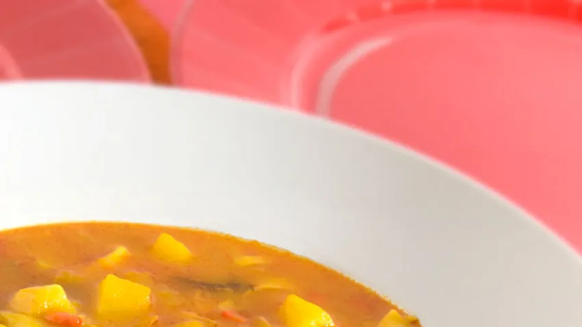 Pica la cebolla, las patatas, el pimiento rojo y el pimiento verde y sofríelos en una cazuela con un chorrito de aceite. Sazona y cuando esté todo bien pochado, añade el tomate picado y el laurel. Sofríe todo y agrega el azafrán, la hierbabuena y el pimentón. Cubre con agua y cocina durante 30-40 minutos.