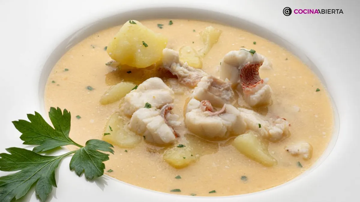 Cuela el caldo a otra cazuela. Pela las patatas, trocéalas (cascándolas), incorpóralas a la cazuela y cuécelas durante 20-25 minutos. Corta los lomos de pescado en trozos de bocado, sazónalos, introdúcelos en la cazuela y cuécelos durante 2-3 minutos.
