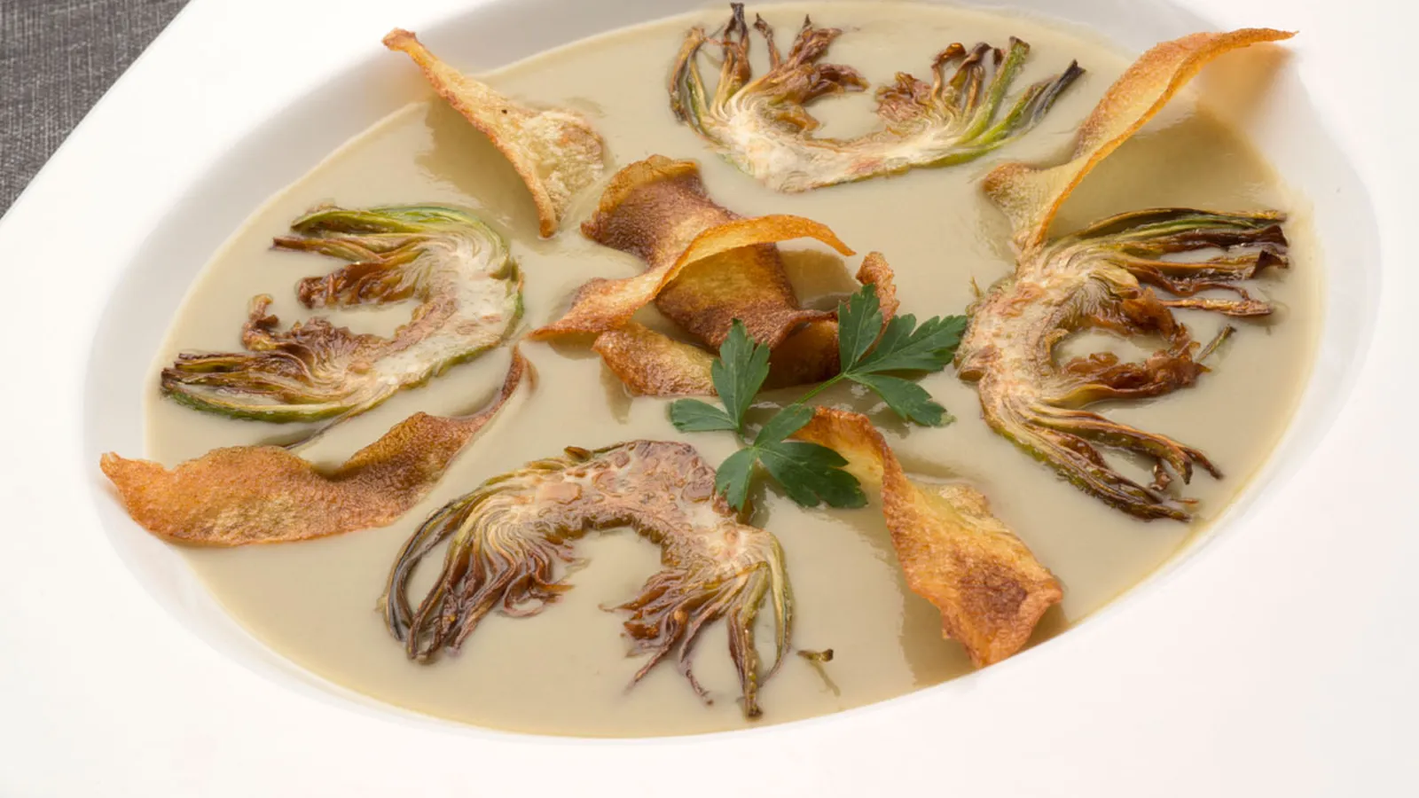 Receta de Karlos Arguiñano de crema de alcachofas decorada con chips de patata y de alcachofa, un plato muy sencillo y saludable, apto para vegetarianos y veganos.