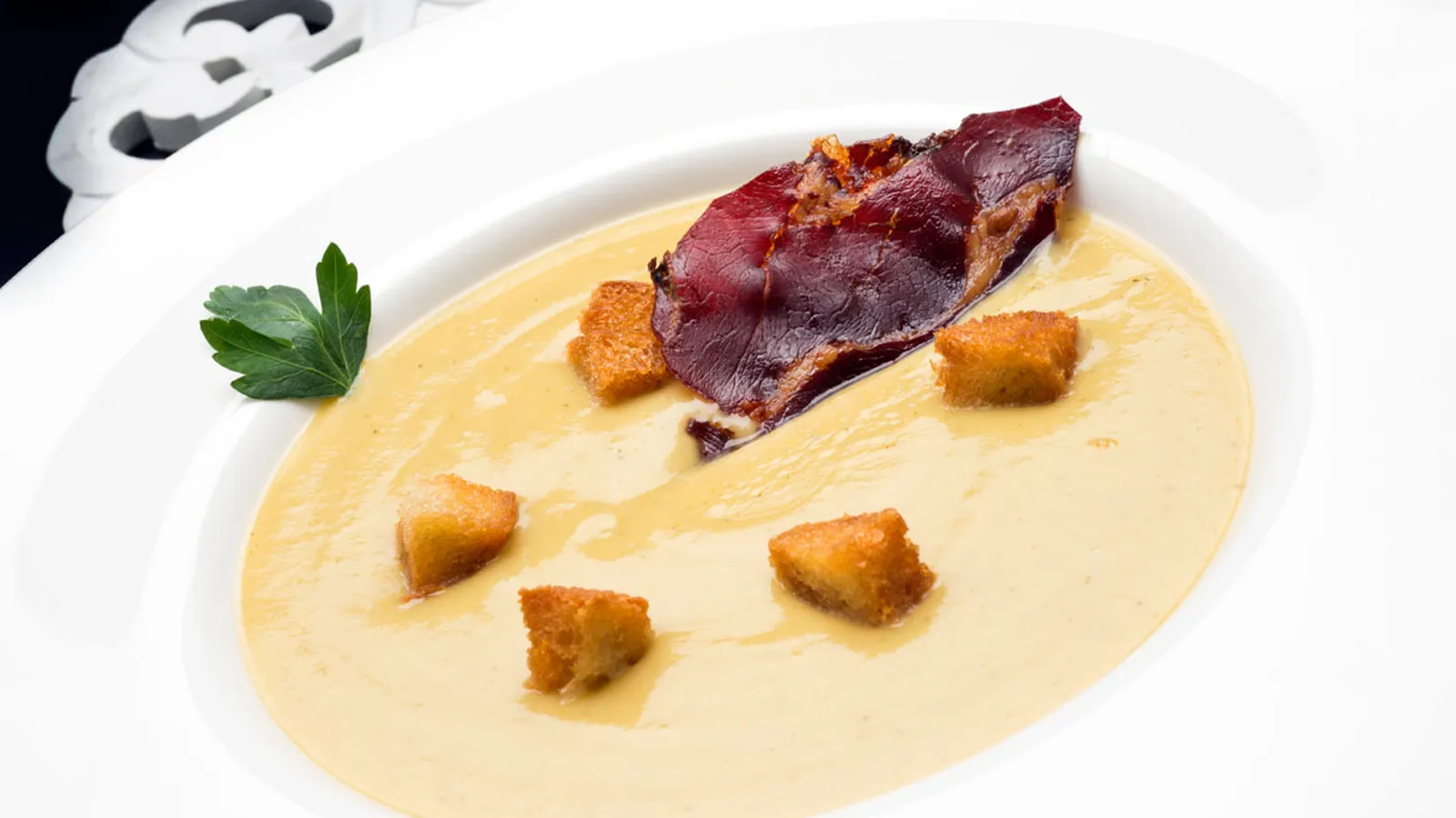 Crema de alubias blancas con costrones de pan y crujiente de cecina