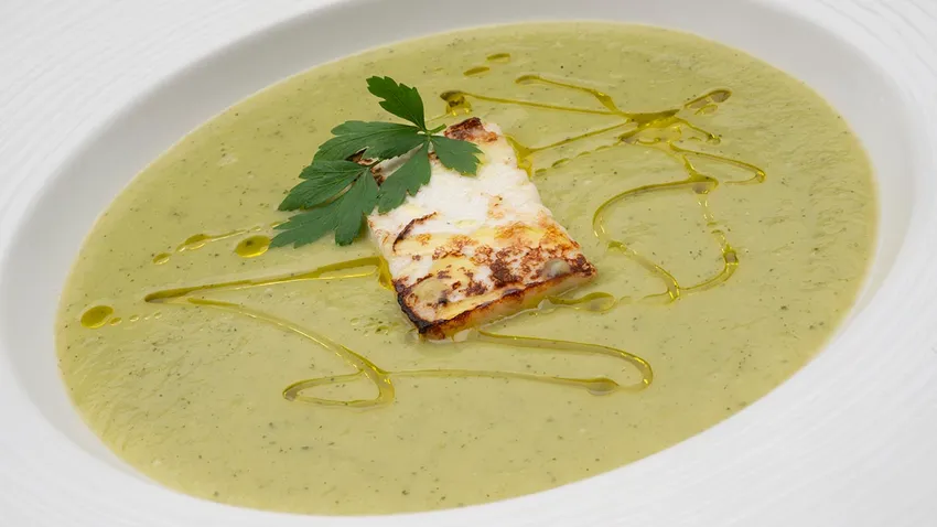 Presentación de la receta Crema de calabacín con queso salteado:
