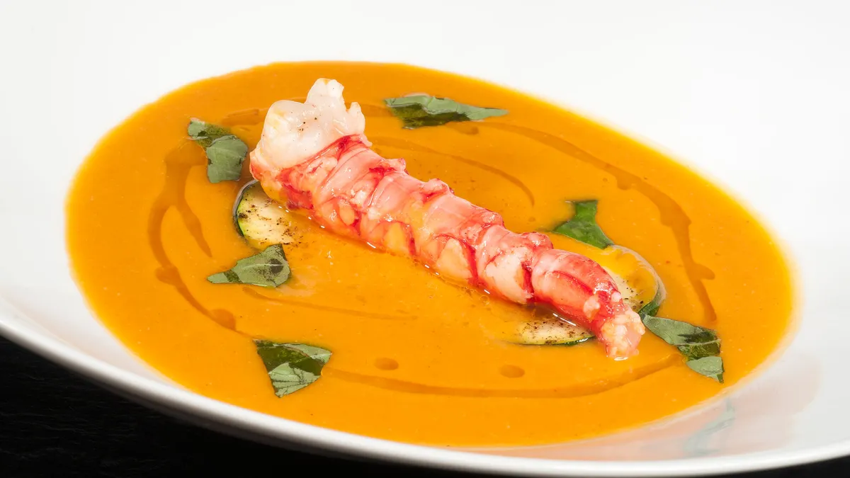 Bruno Oteiza elabora una crema con calabaza, carabineros, zanahoria, naranja y yogur. La acompaña con una brocheta de carabinero y calabacín a la plancha.