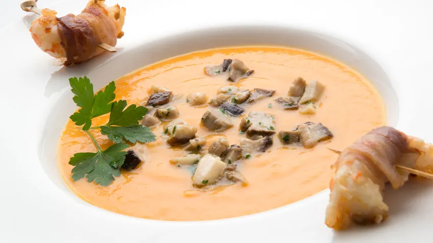 Receta de Karlos Arguiñano de crema de calabaza acompañada de hongos salteados y brochetas de cigalas envueltas en bacon, un plato sencillo y nutritivo.