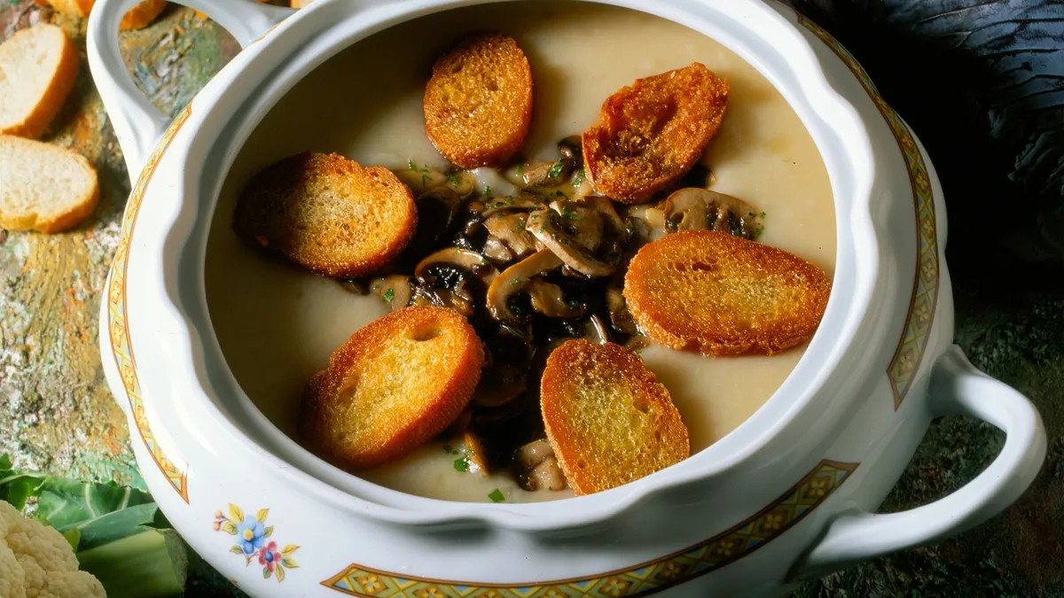 Deliciosa crema otoñal realizada compuesta de coliflor, patatas y champiñones y acompañada de pan frito. Receta de Karlos Arguiñano.
