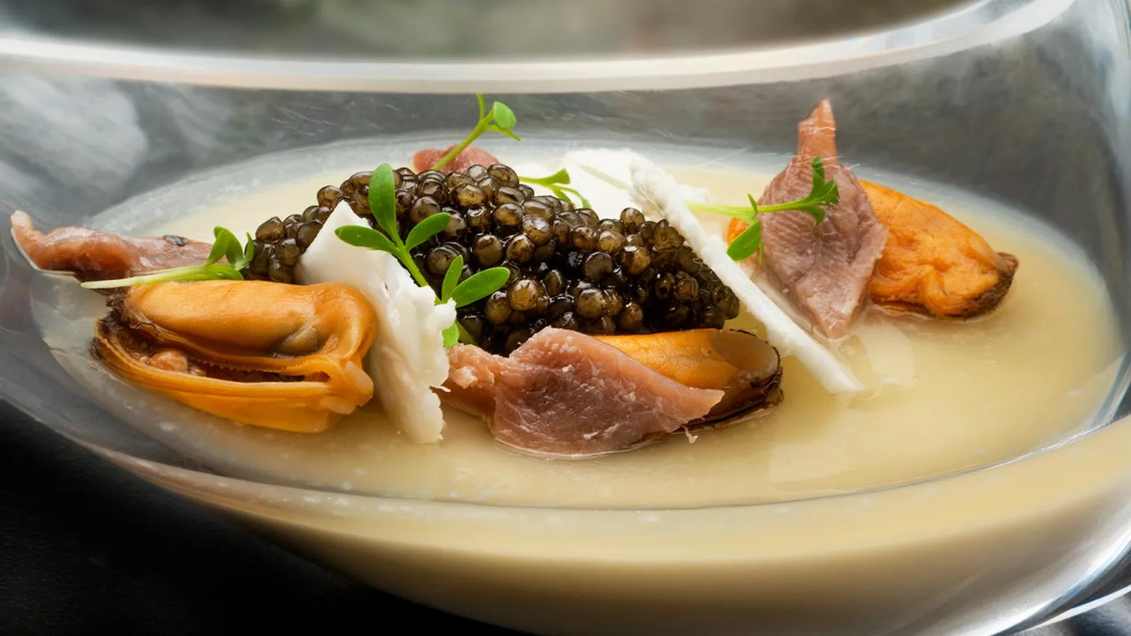 Sacar el plato cuajado 15 minutos antes de comer. Y al momento de servirlo sobre la base de la gelee, repartir los mejillones cocidos, las laminas de coliflor cruda, las anchoas, el caviar y terminaremos con unos brotes.