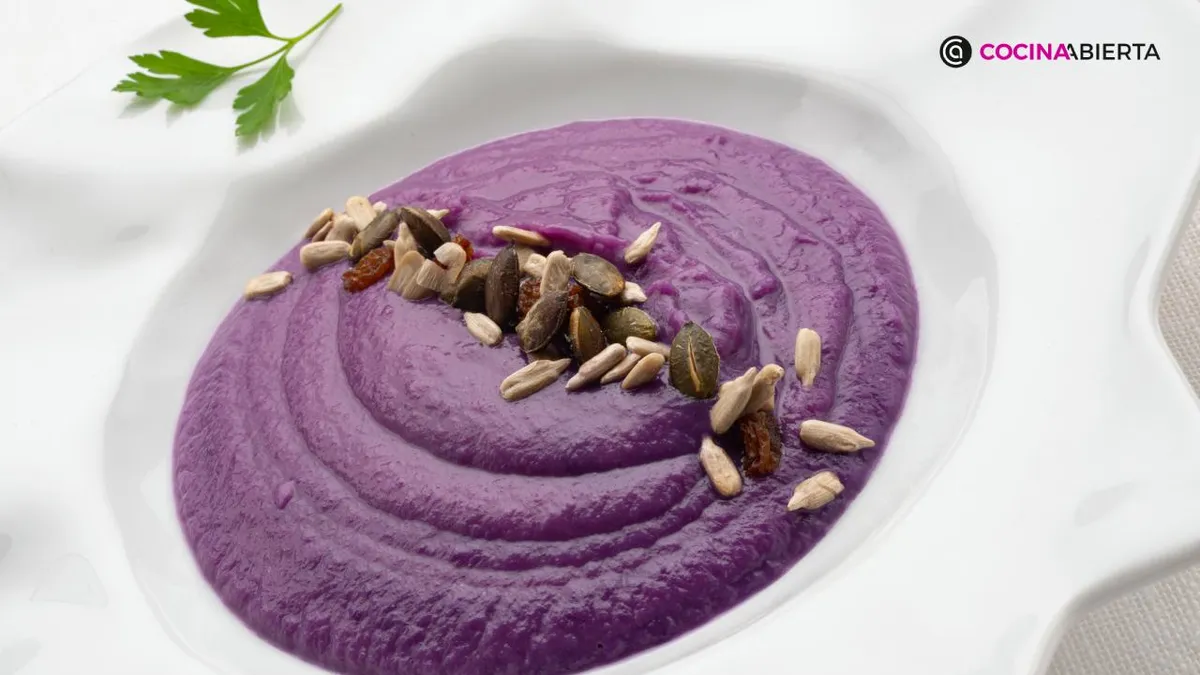 Esta crema, de un color morado llamativo y muy apetecible, es sencilla de elaborar. Además de la col lombarda, lleva patata y pera, y se acompaña con pasas, pipas de calabaza y girasol.