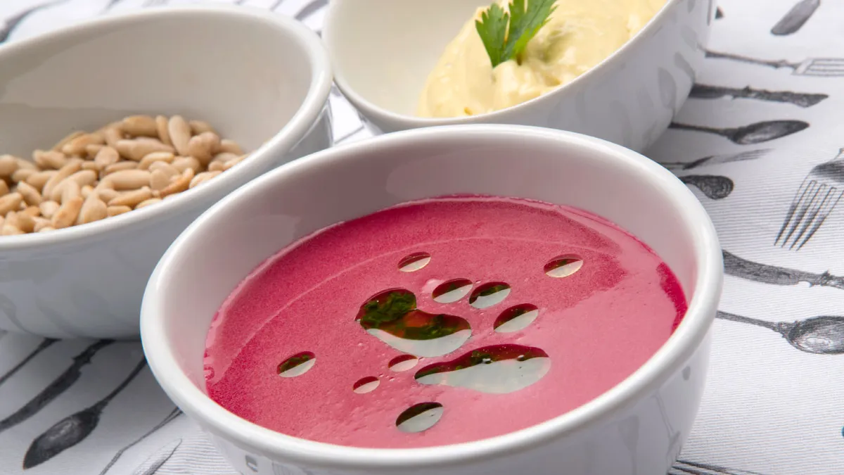Receta de Karlos Arguiñano de crema fría de remolacha acompañada de majado de albahaca, piñones y mahonesa de queso azul.