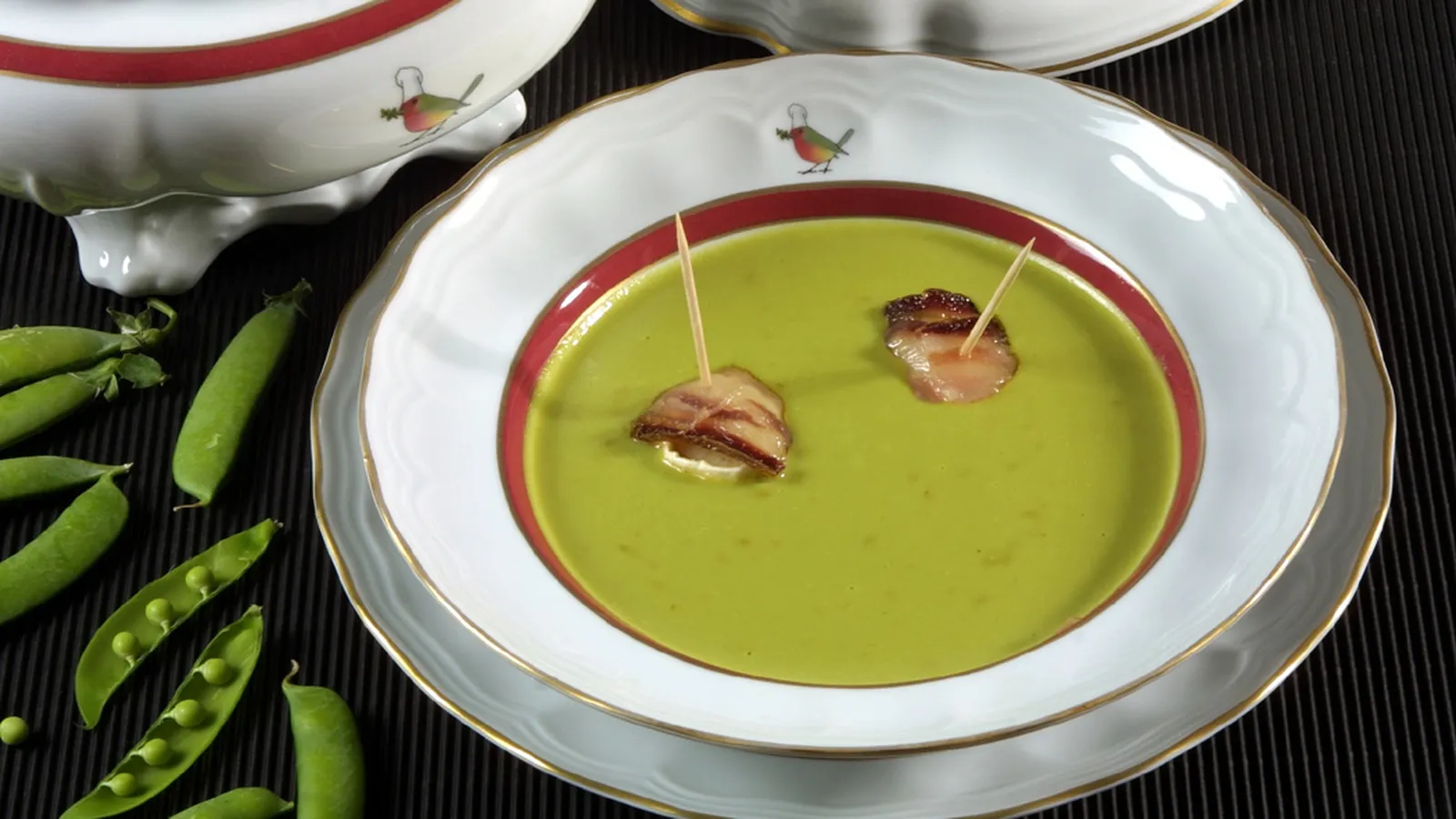 Karlos Arguiñano elabora una suave crema de guisantes con tropezones fritos de queso de cabra envueltos en tocineta. Una receta con mucho sabor ideal como primer plato.