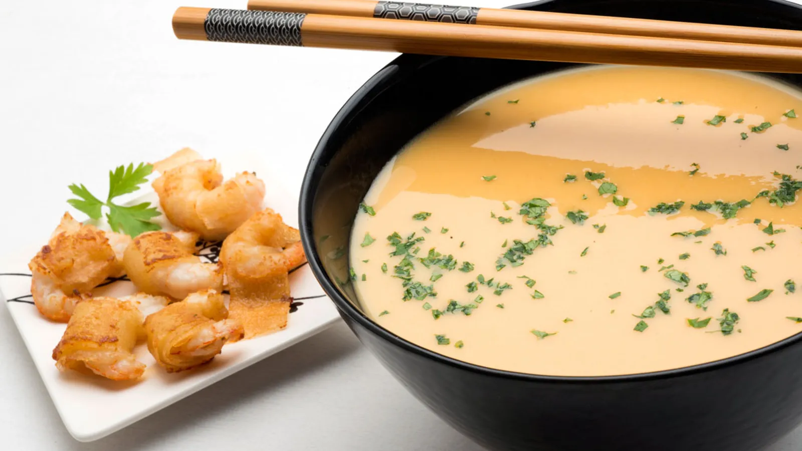 Receta de Karlos Arguiñano de crema de lentejas naranjas y calabaza acompañada de gambas fritas envueltas en pasta brick.