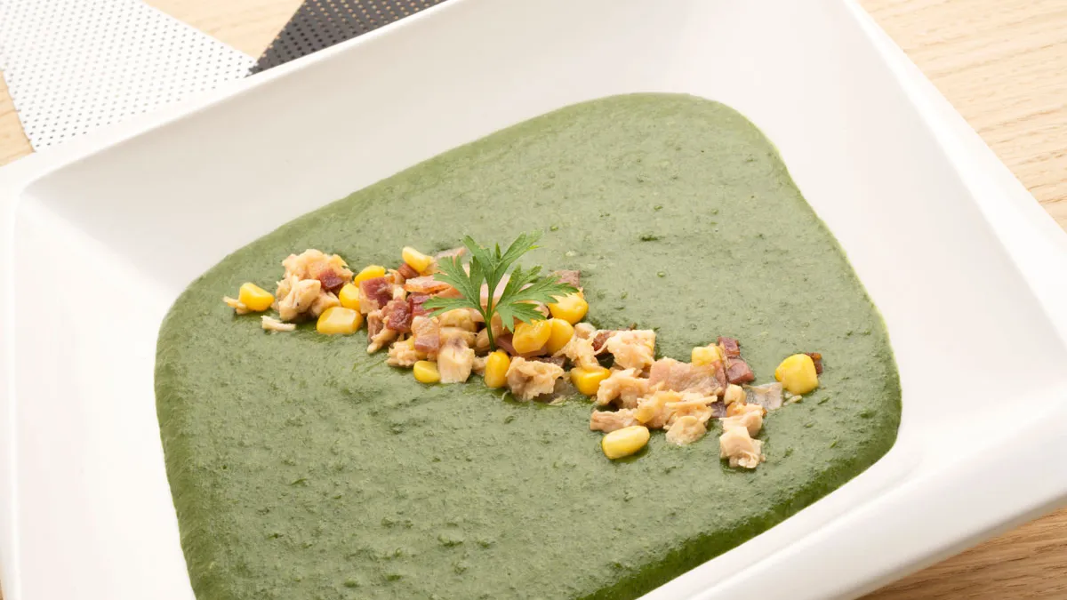 Crema ligera de espinacas con maíz, tocineta y pollo