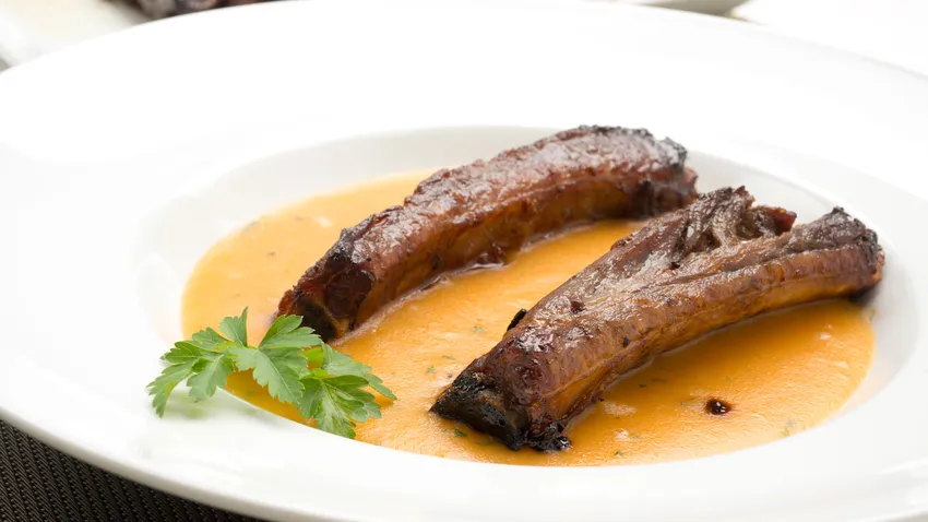Crema de patata al pimentón con costilla de cerdo asada