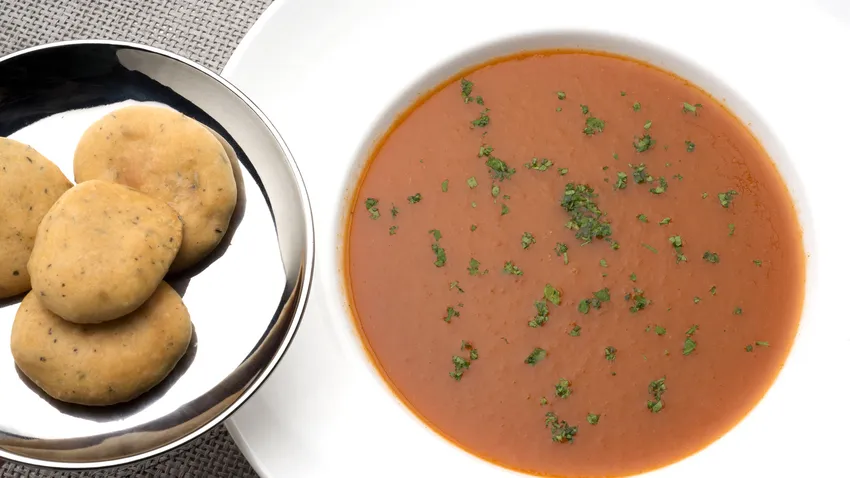 Karlos Arguiñano elabora una crema de tomate, pimiento rojo y cebolleta asados en el horno y la acompaña de galletas saladas a las hierbas provenzales. Una receta vegana y saludable.
