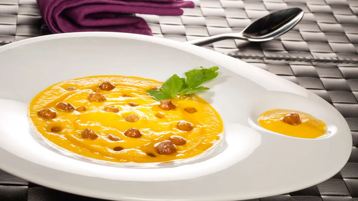 Receta de Bruno Oteiza de crema de zanahorias asadas con cebolla, ajos, apio y yogur y acompañada de garbanzos crujientes tostados en el horno. Un plato sencillo, saludable y apto para vegetarianos.