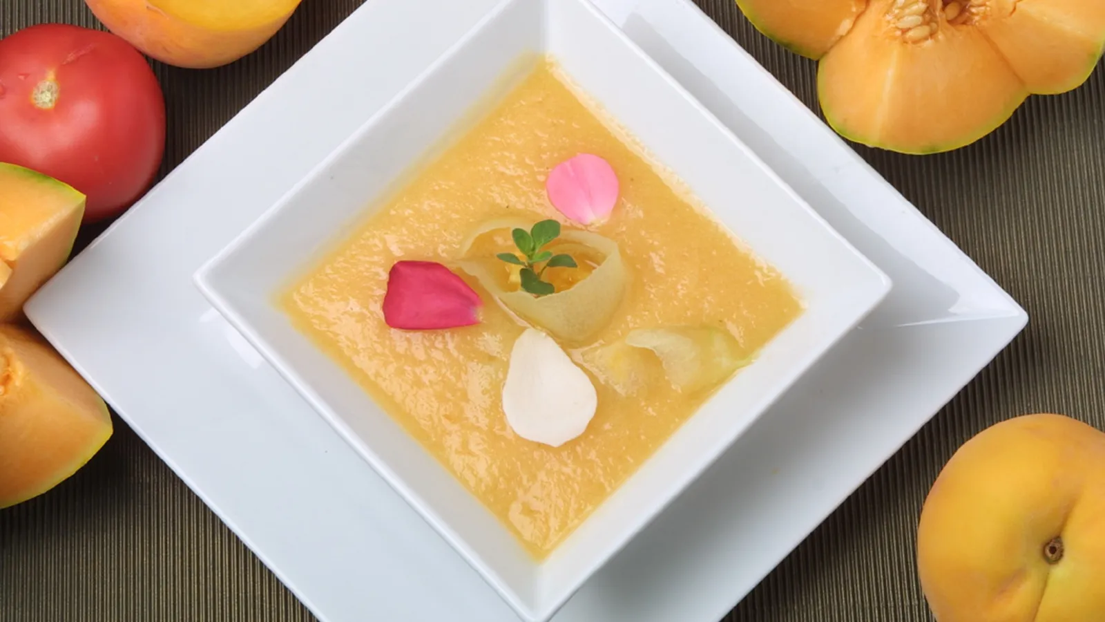 Karlos Arguiñano prepara una receta muy apreciada en verano: refrescante gazpacho de melón y su guarnición de melocotón, petalos de flores comestibles y orégano.