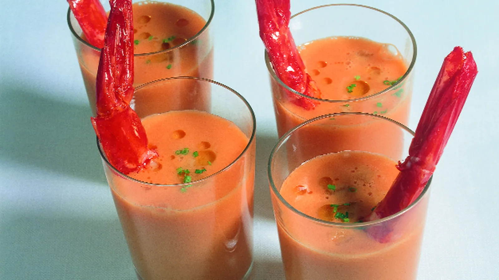 Sirve el gazpacho en unos vasitos o copas. Introduce el pan crujiente y las gambas con la punta de la cola sin pelar hacia arriba. Espolvorea por encima con un poco de albahaca picada.