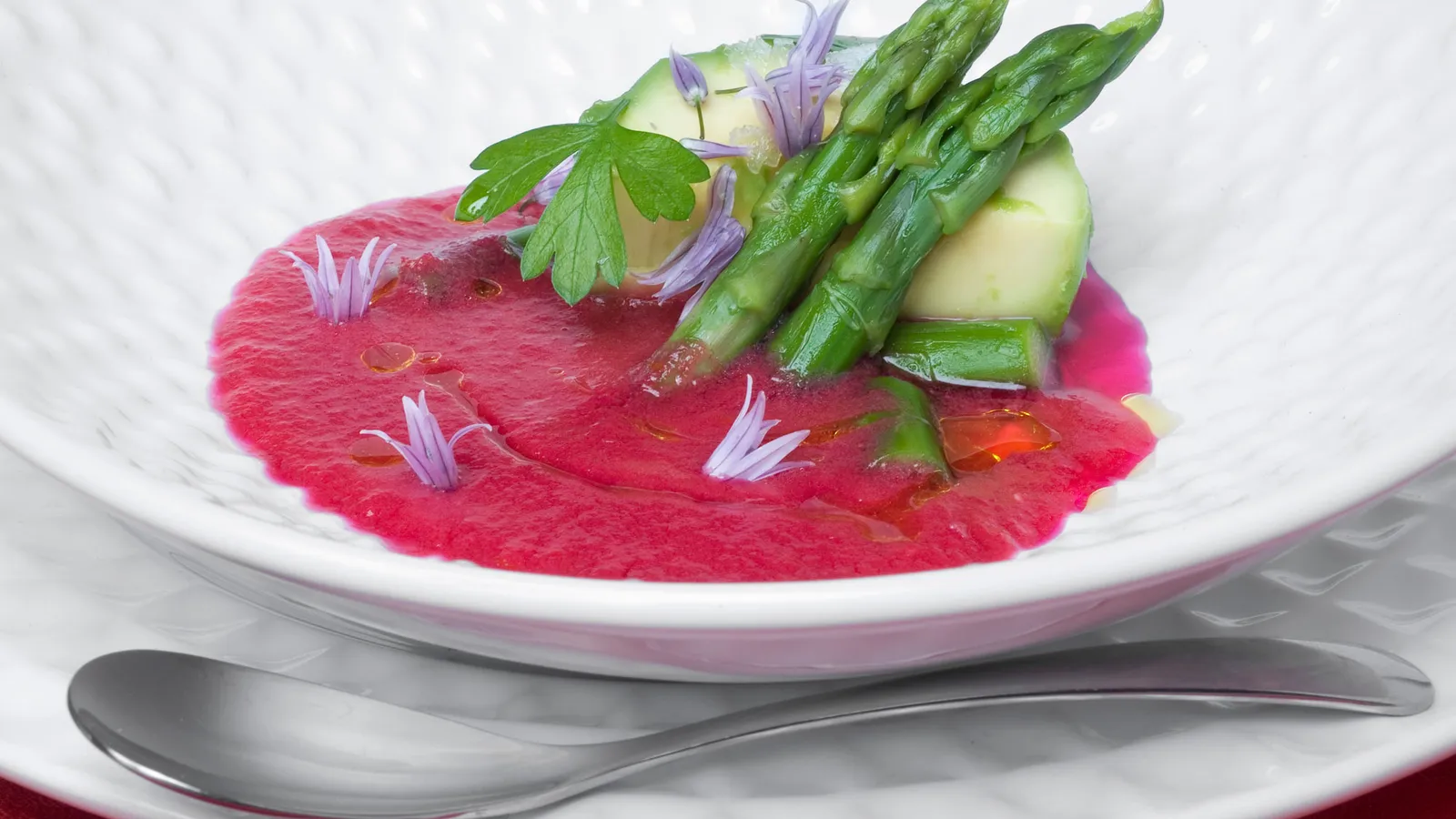 Gazpacho de sandía y remolacha con aguacate y espárragos