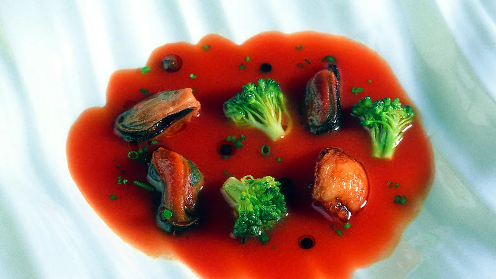 Deliciosa y sencilla versión gourmet de la tradicional receta de sopa fría andaluza: Gazpacho de tomate asado con mejillones y verduras escabechados de Juan Mari Arzak