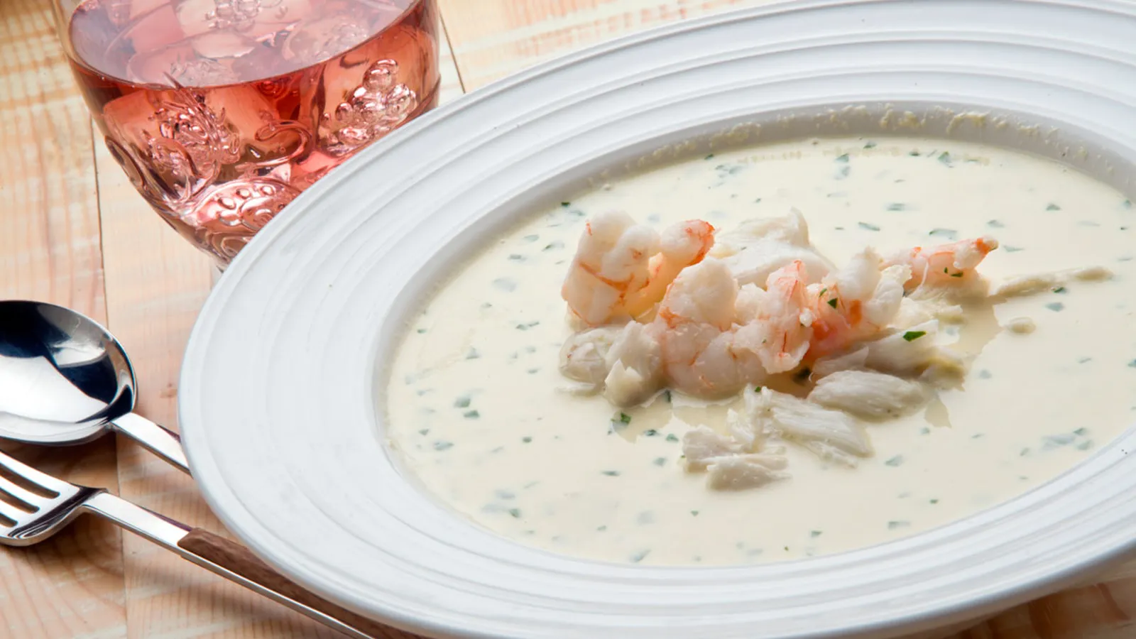 Agrega las gambas peladas, déjalas 1 minuto y sácalas. Incorpora el pescado y cuécelo durante 5 minutos. Retira el pescado. Deja que se temple el caldo.