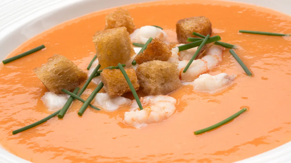 Receta de salmorejo, con tomate y mango como ingredientes principales. Acompañamos esta sopa fría con unos dados de rape y gambas salteadas y costrones de pan. Un plato fresco para el verano elaborado por Karlos Arguiñano.
