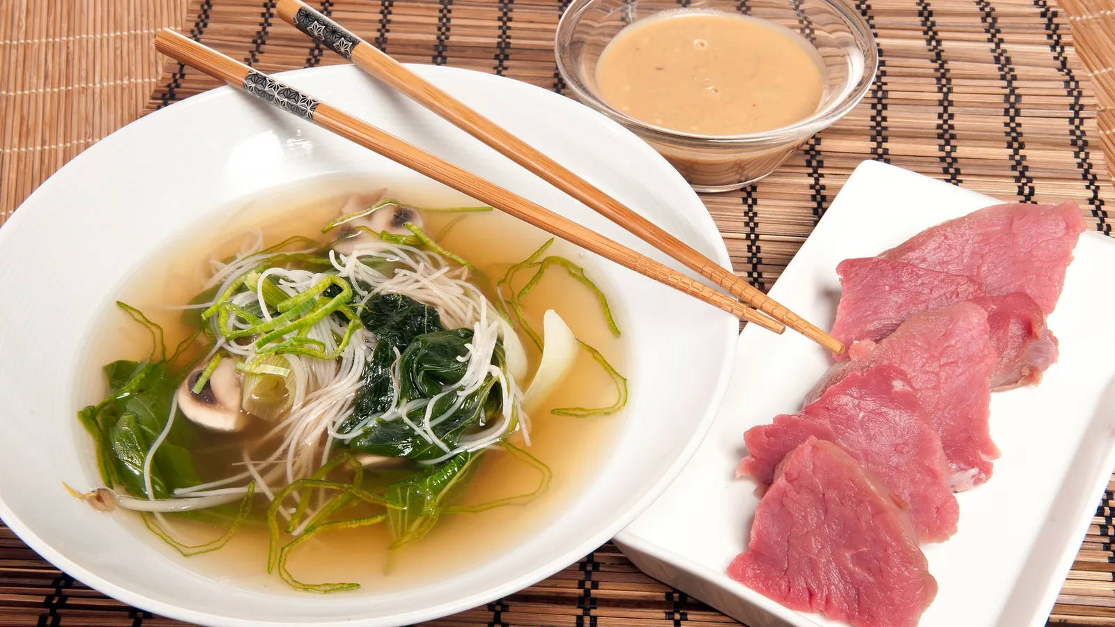 Distribuye la carne entre tus comensales para que cada uno la coja con sus palillos y la introduzca en el caldo. Después, en la salsa de cacahuete y a la boca. Igualmente con todos los demás ingredientes, como si se tratara de una fondue.