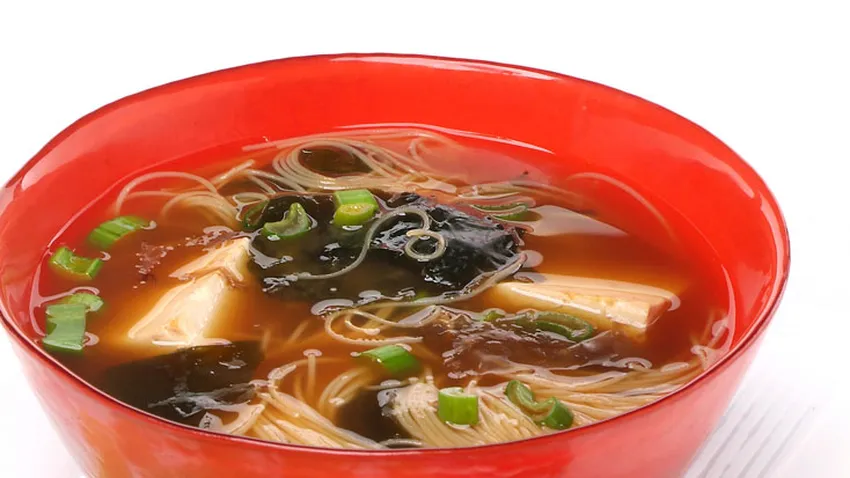 Pon agua a cocer con el dashinomoto, un poco de hondashi, el wakame y la salsa de soja. Cocina durante unos 10 minutos, corta el tofu en dados y añádelo al caldo. Sigue cocinando y añade el fideo un par de minutos antes de servir.