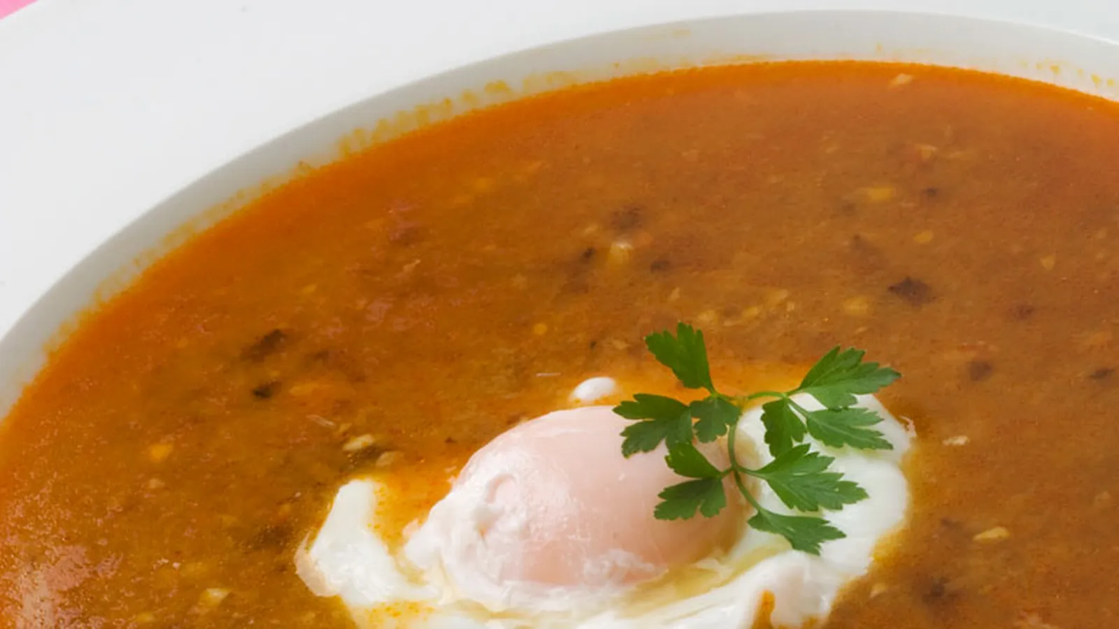 Pon en una cazuela agua con un chorrito de vinagre. Cuando el agua esté a punto de hervir casca los huevos y deja que se escalfen durante 4 minutos. Retíralos a un plato. Sirve la sopa en un plato hondo y coloca encima un huevo escalfado. Decora con una hojita de perejil.