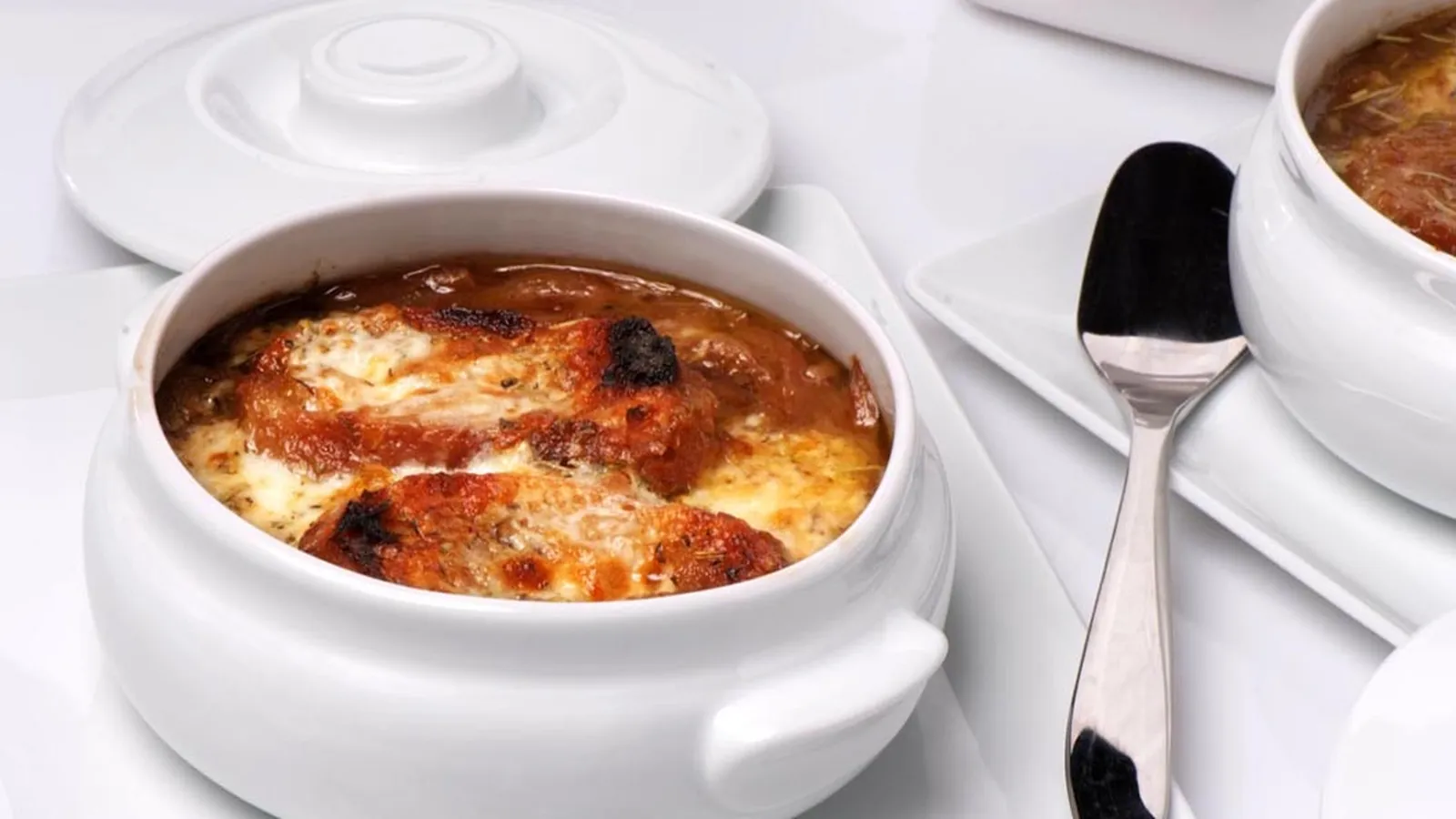 La tradicional receta de sopa de cebolla al estilo casero, con cebolla morada y rebanas de pan duro, elaborada por el cocinero Enrique Fleischmann.
