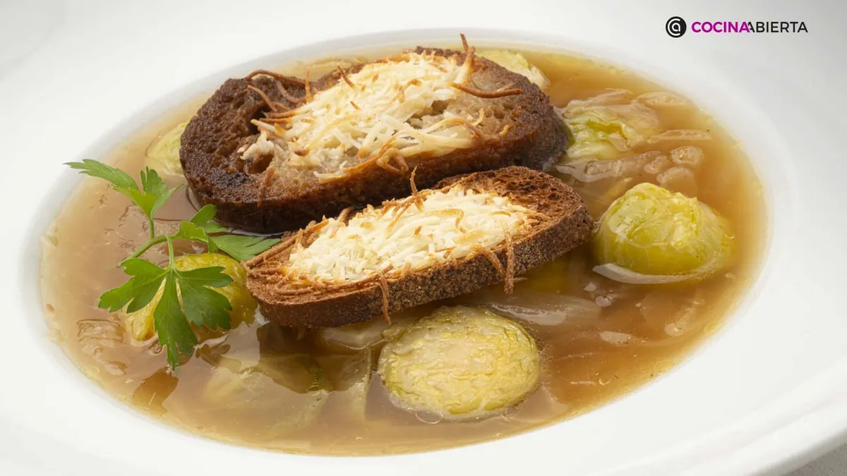 Karlos Arguiñano elabora en Cocina Abierta una receta clásica y de origen francés: Sopa de cebolla y coles de Bruselas, un plato humilde y económico, reconfortante, saludable y muy apetecible ¡anímate a prepararlo!