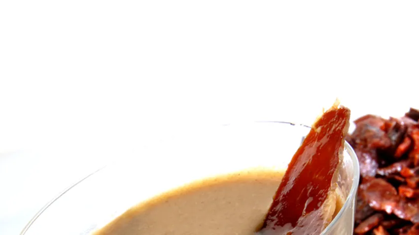 Sopa de ajo en crema. Karlos Arguiñano nos soprende con una versión de la típica receta de sopa de ajos y la transforma en crema acompañada de jamón crujiente, chorizo, ajo frito y perejil. ¡Exquisito y diferente!