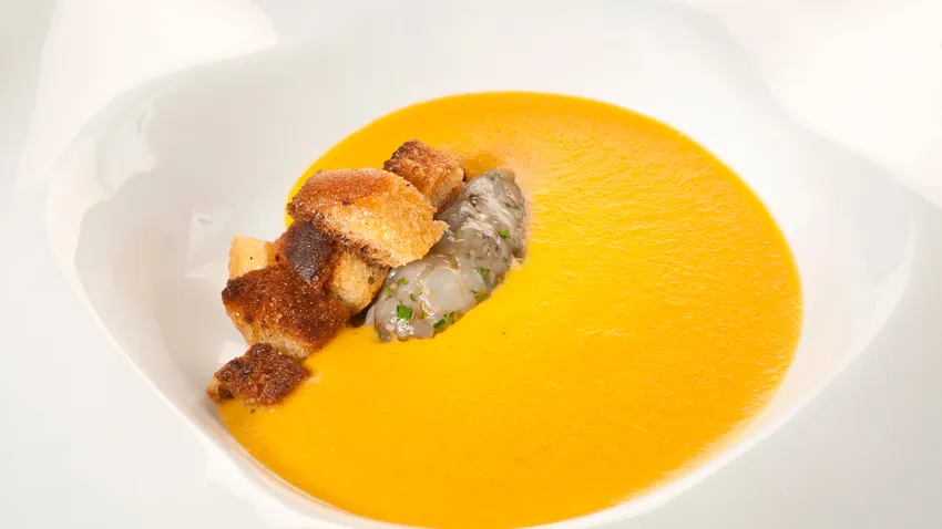 Receta de Bruno Oteiza de Sopa à la crézy, una deliciosa sopa de zanahorias acompañada de langostinos y picatostes.