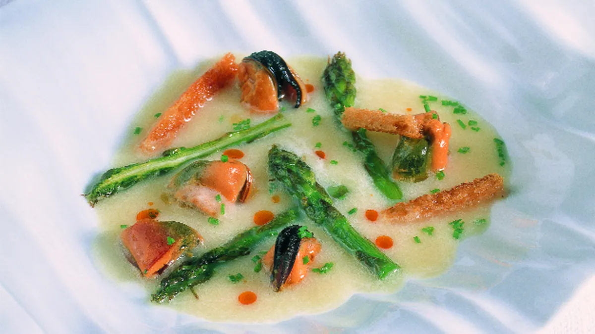 Una receta de Juan Mari Arzak de sopa de espárragos blancos con espárragos verdes fritos con mejillones al aroma de regaliz.