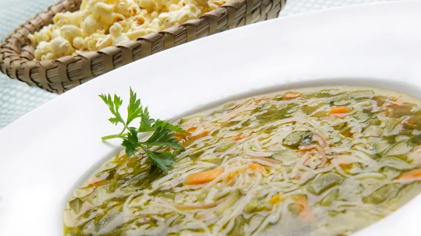 Receta de Karlos Arguiñano de sopa de fideos y verduras acompañada de palomitas de maíz al curry, un plato saludable apto para vegetarianos, veganos y personas con colesterol alto.