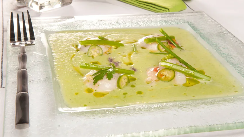 Sirve la sopa en un plato y coloca encima las zamburiñas marinadas, unas rueditas de chile muy finas, unas ramitas de apio y unas hojas de perejil. Moja con un chorro de aceite de oliva virgen extra.
