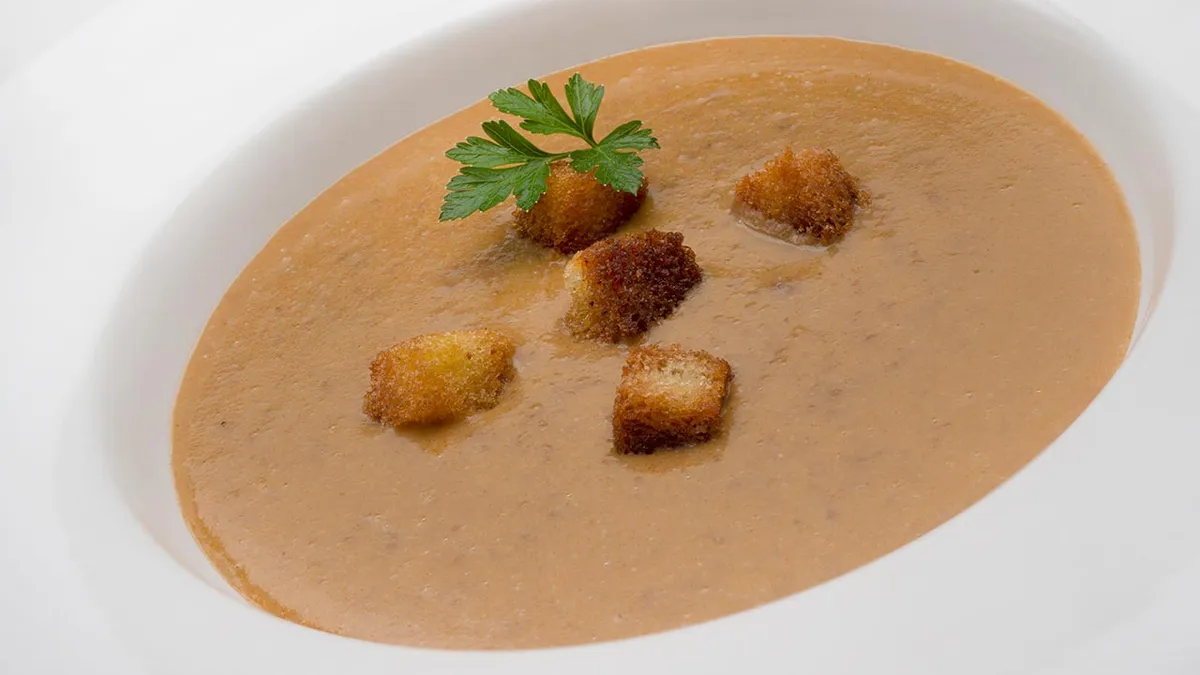 Sirve la sopa con los costrones de pan frito. Decora los platos con unas hojas de perejil.