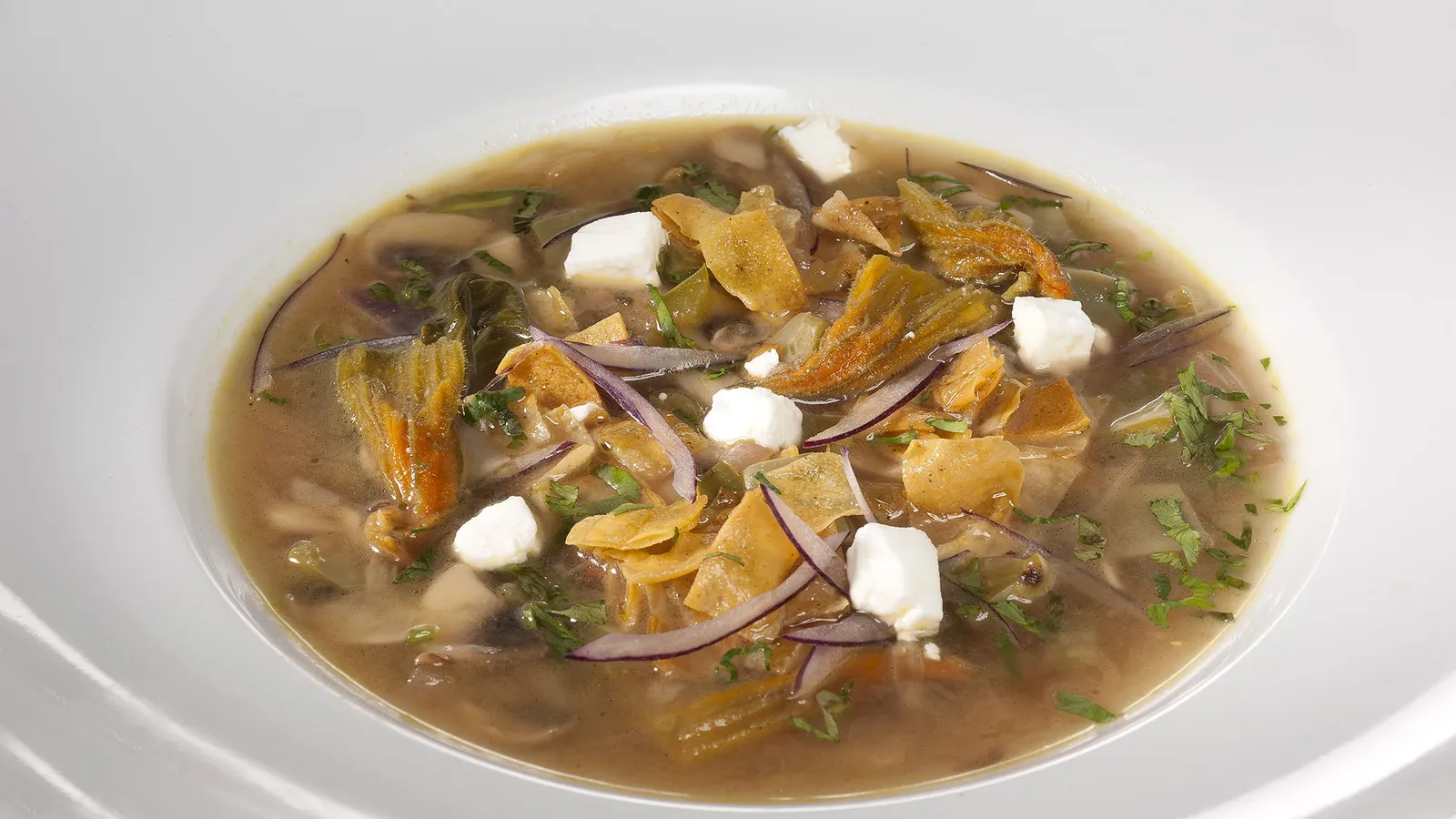 Bruno Oteiza prepara sopa de milpa con champiñones, nopal, cebolla, chiles, queso, cilantro y tortillas de maíz crujientes. Un plato con sabor mexicano.