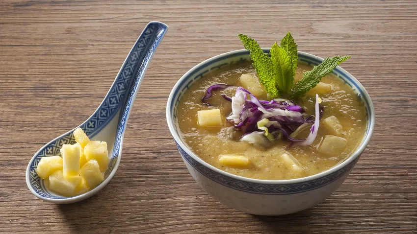 Vierte la sopa en un cuenco. Coloca encima un montoncito de prensado de col. Decora con unos daditos de piña y unas hojitas de menta. Sirve.