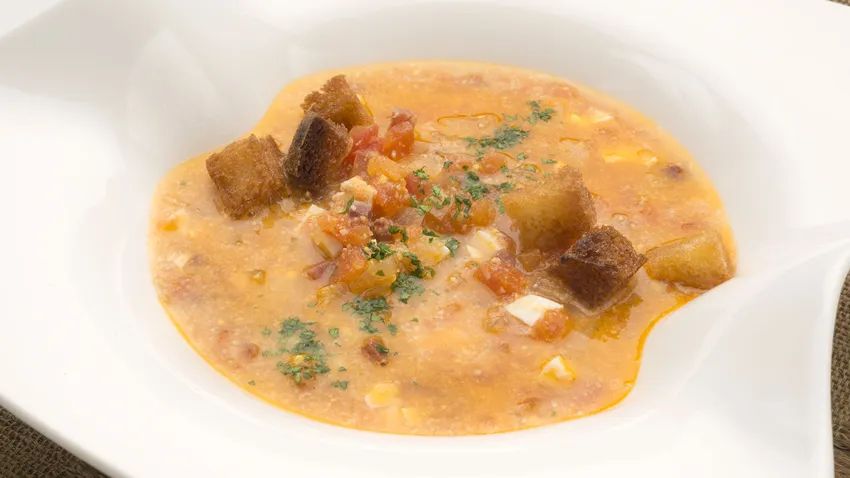 Karlos Arguiñano prepara sopa serrana, un plato típico de Málaga a base de jamón serrano, tomate, cebolla, almendra, ajo, huevo cocido y picatostes.