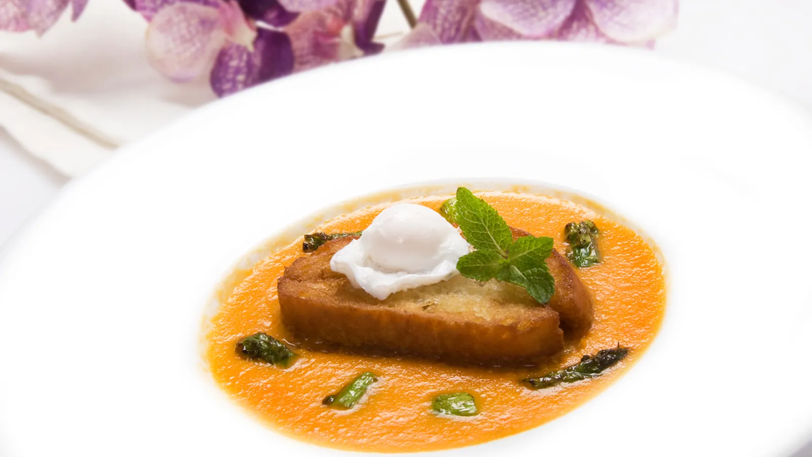 Sirve la sopa en plato hondo y coloca encima una rebanada de pan frito con un huevo escalfado y unas hojas de menta. Acompaña con los espárragos verdes y sirve.