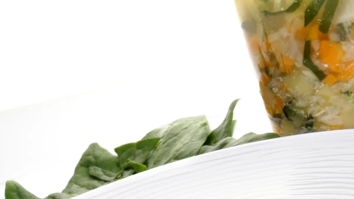 Ligera receta de sopa de verduras con albahaca y piñones: zanahoria, puerros, patata y nado. Receta de Karlos Arguiñano.