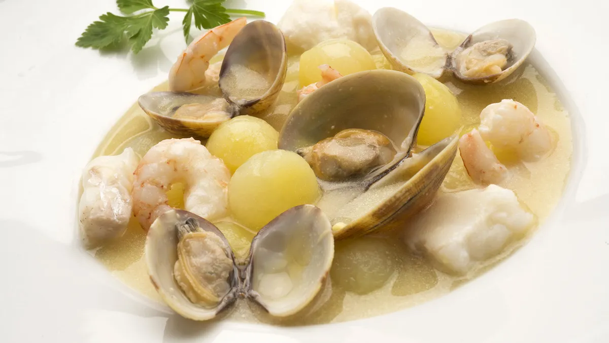 Mientras tanto, pela las patatas y con una cuchara parisien (sacabolitas) saca bolitas de patata. Añádelas al caldo y sazónalo. Incorpora también el caldo que han soltado las almejas. Cuece las bolitas de patata durante unos 10 minutos aproximadamente.