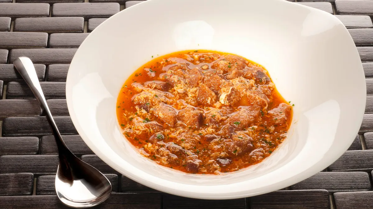 Receta de sopa de ajo con huevo, pan tostado y pimientos choricero. Plato de cuchara elaborado por Bruno Oteiza.