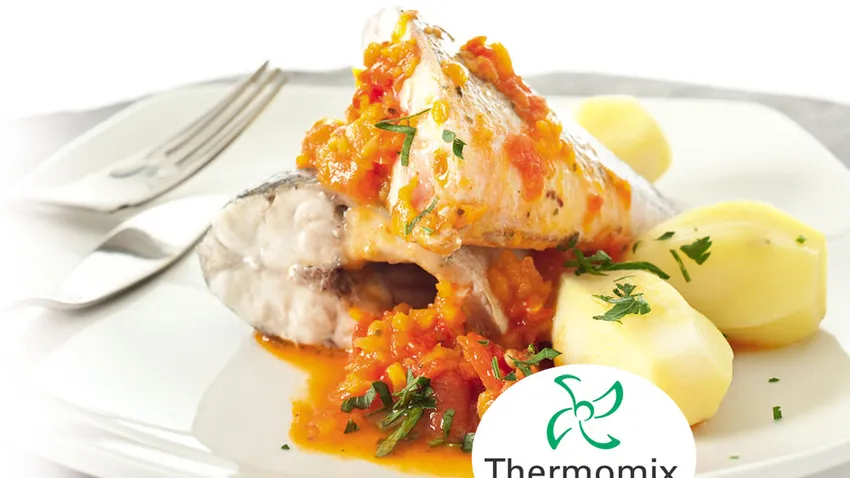 Lubina y patatas al vapor con salsa de verduras rojas para Thermomix