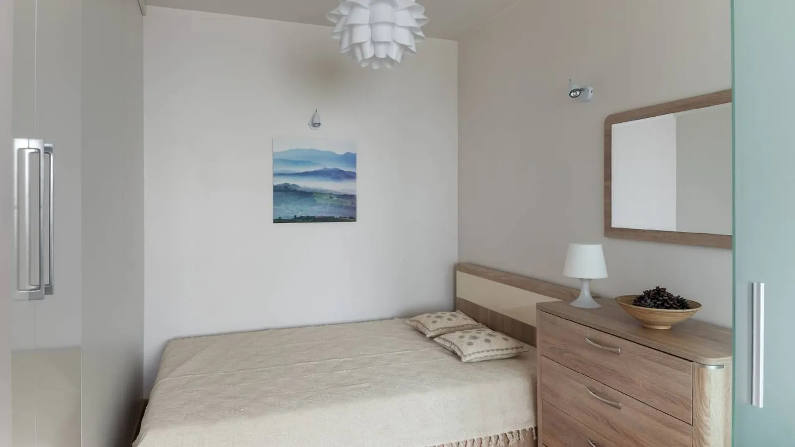 También puedes utilizar mesillas de noche y lámparas que vayan colocadas en la pared (esto te ayudará también a limpiar), para ahorrar espacio en los laterales de la cama.