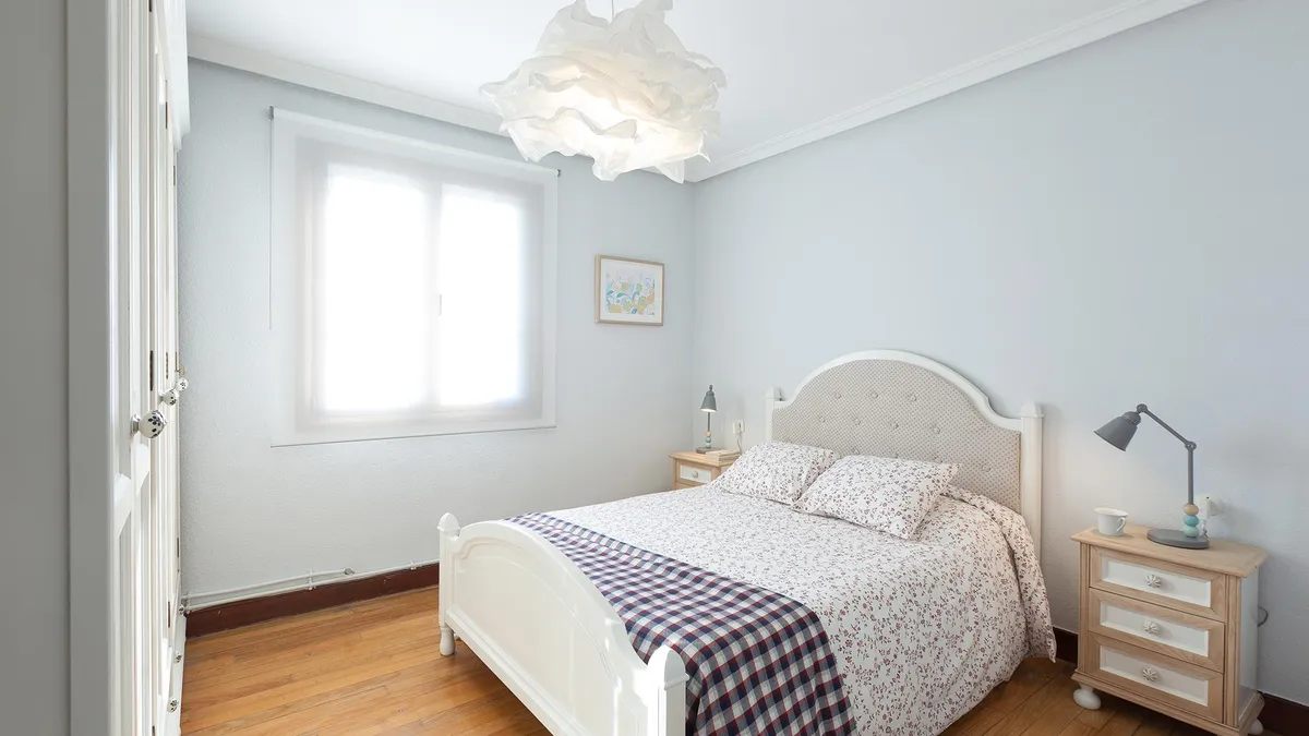 Hemos sustituido las cortinas por un estor blanco más moderno y luminoso y colocado un burlete para aislar bien el dormitorio del exterior.