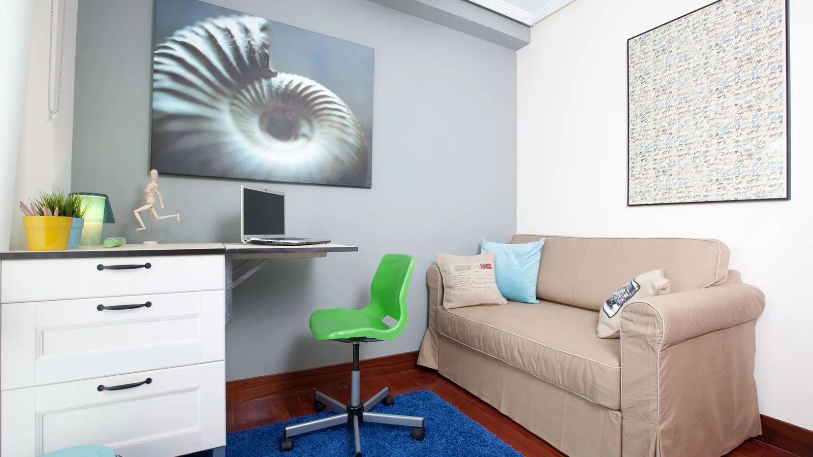 Para terminar la decoración de la habitación para alquilar vamos a colocar unas letras en las puertas de los armarios a modo de tirador, colocaremos un sofá cama, un perchero, una alfombra y unos cuadros