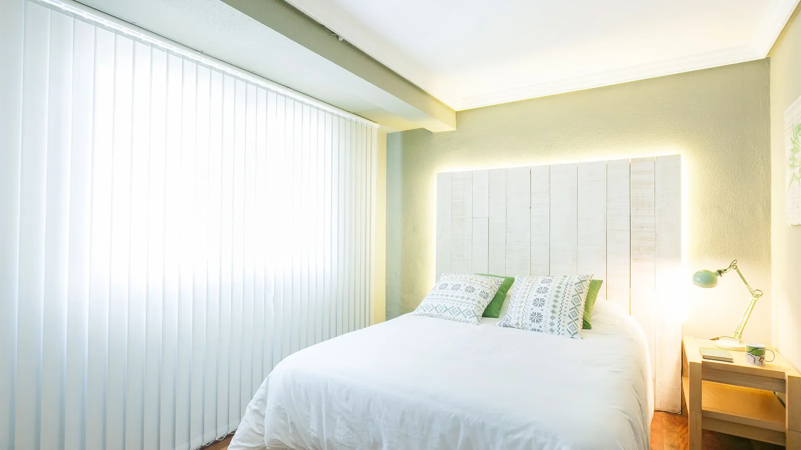 Para terminar y darle un estilo natural, unos cuadros en la pared, una nueva ropa de cama y una tira de luces led para habitación alrededor del nuevo cabecero.