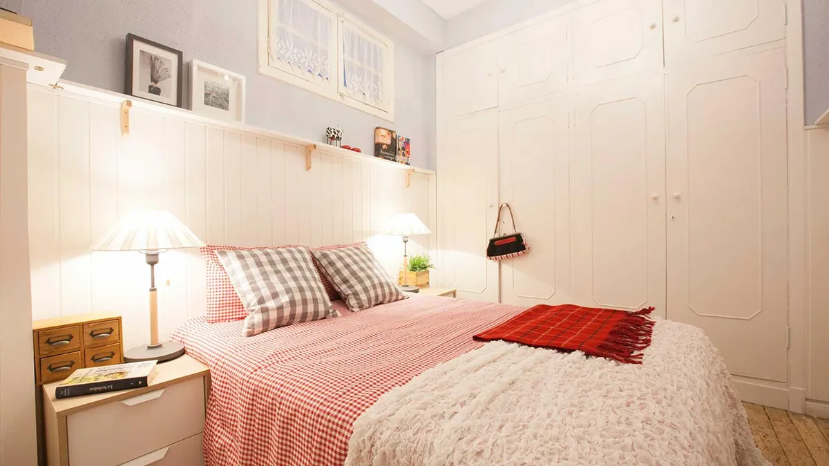 Por suerte, el armario es empotrado, lo que ayuda a aprovechar aún más el espacio de la habitación. Para lograr un dormitorio de matrimonio luminoso, lo primero será pintar el armario de blanco y las paredes de un tono azul grisáceo.