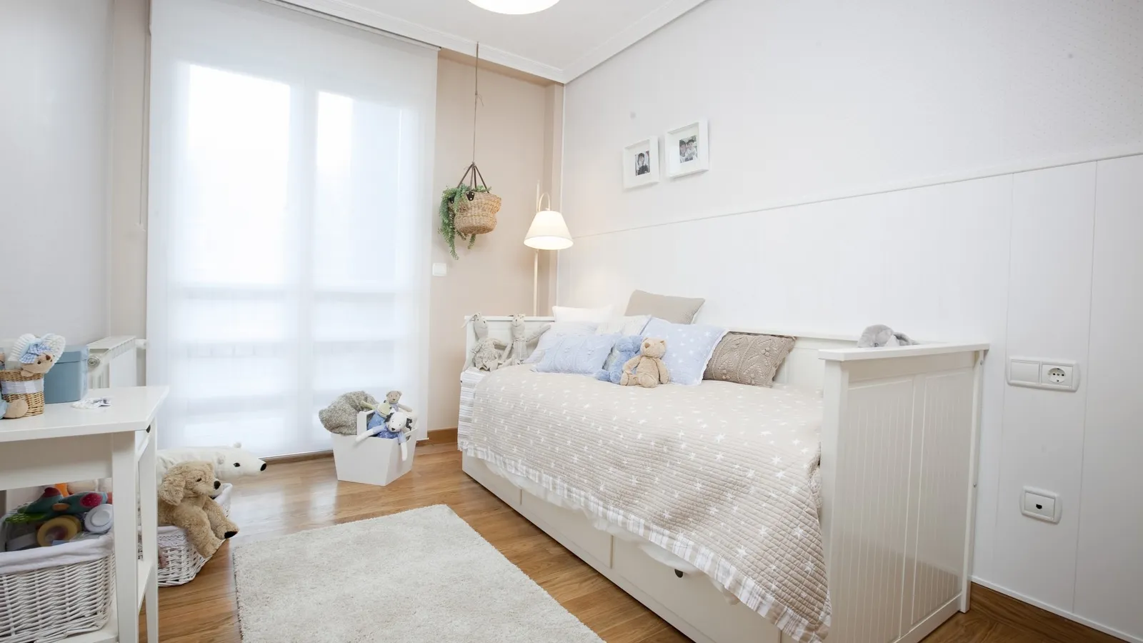 Y el toque decorativo final. Colocaremos la cama con su alfombra a juego, un estor y unos cuadros. Además, los cojines y los muñecos completarán una zona de juegos que encantará a cualquier niño. Una manera sencilla de decorar una habitación infantil y tranquila.