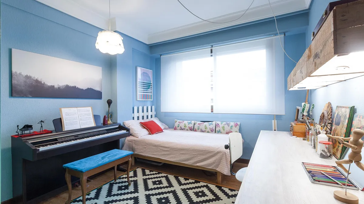 Decoramos una habitación con un piano para crear un estudio de pintura y música juvenil actualizado.
