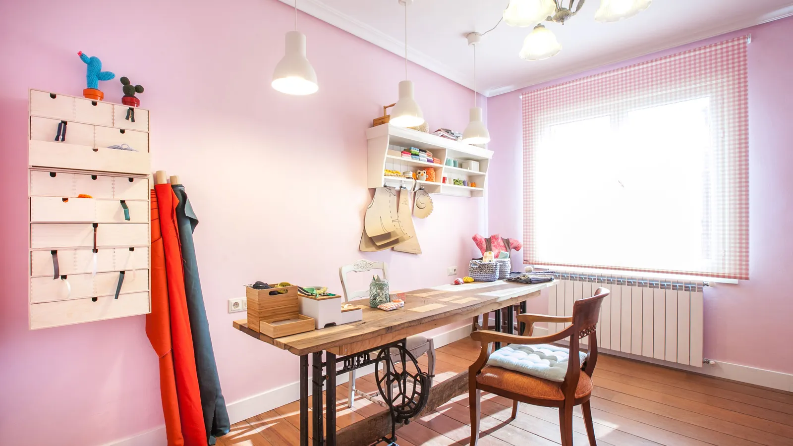 De esta forma tan sencilla hemos convertido una habitación vacía en una habitación de costura a la que no le falta detalle. Una taller de costura casero perfecto para trabajar desde casa.